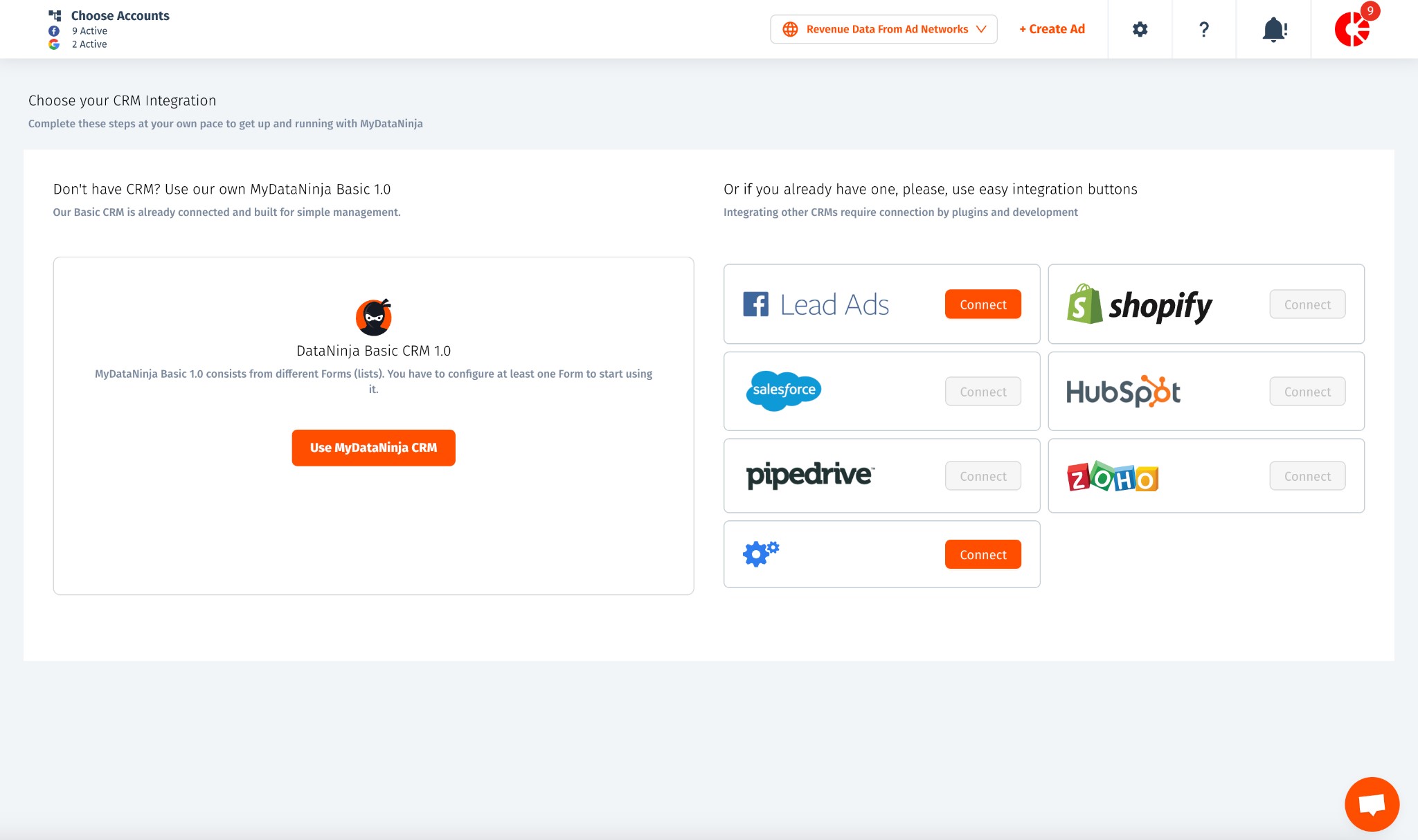 If your CRM is already linked to Google Ads and/or Meta Ads, seamlessly sending revenue data to these platforms, and you aim to use MyDataNinja as a unified reporting and dashboard system, opt for “Revenue Data from Ad Networks.” This option fetches revenue from the networks and generates reports based on this data.