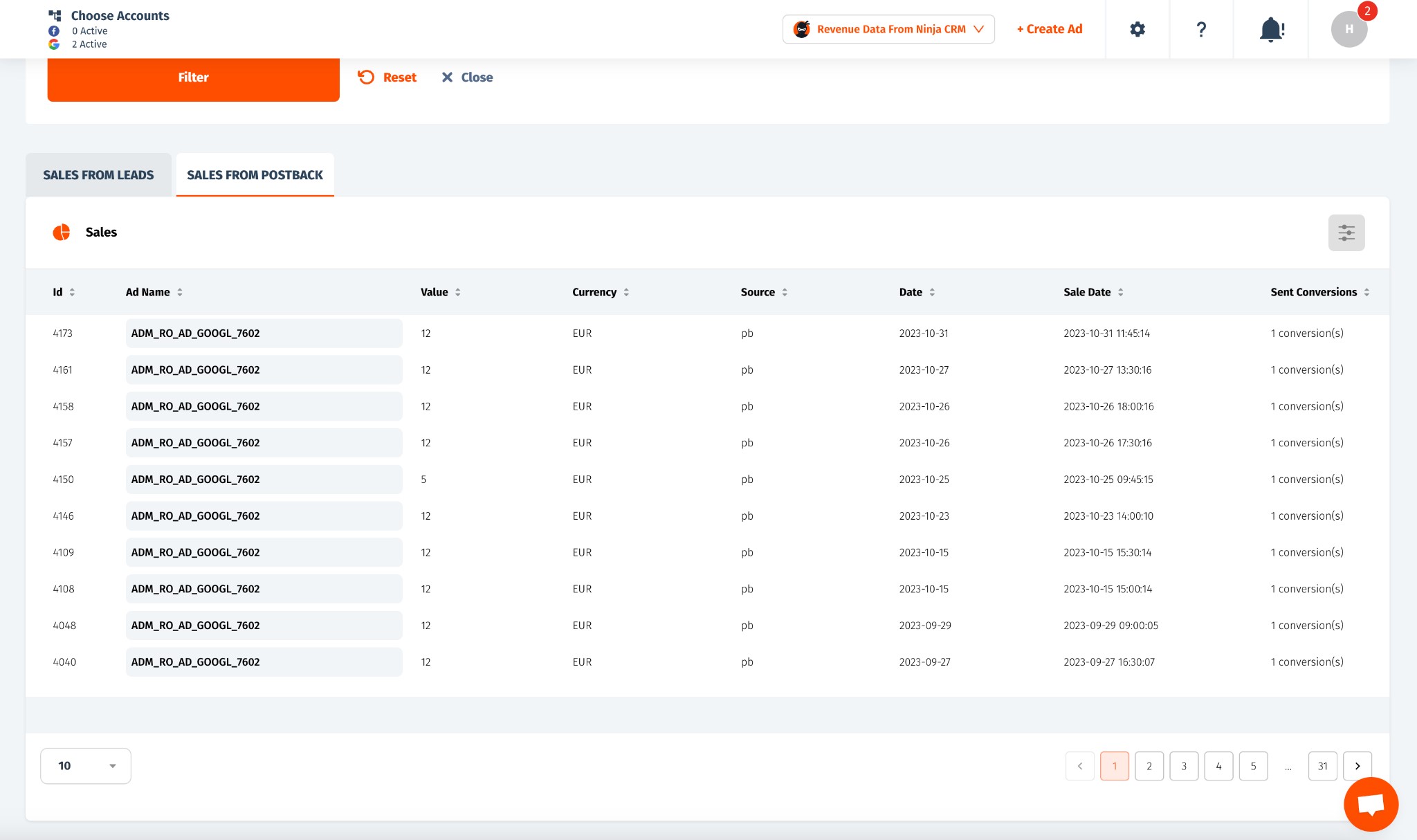 Each sale is linked to an advertisement, and there is also information indicating whether this sale has been reported or sent to Google or Meta through Conversions API integration with the advertising platforms.