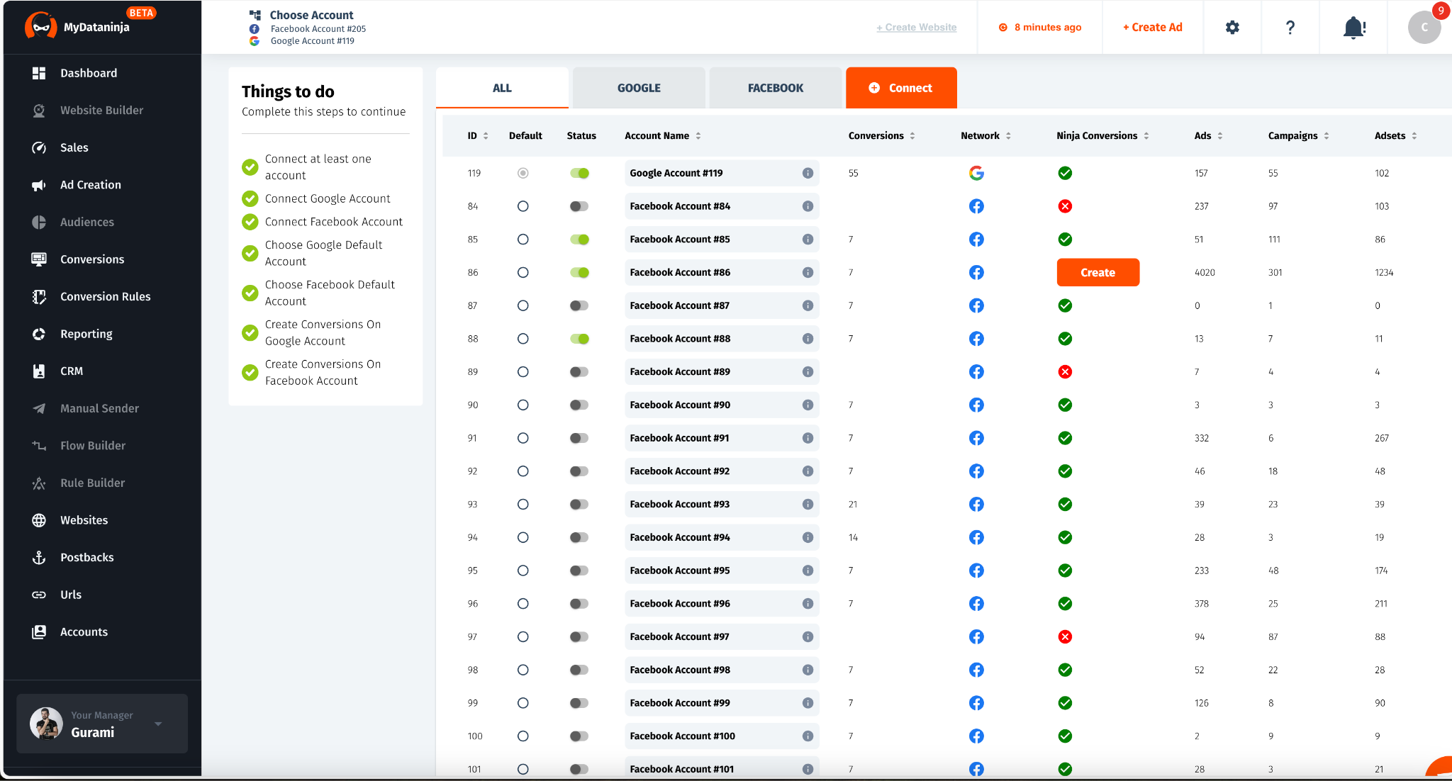 2. Ninja Conversions: For Facebook, it verifies pixel connections in accounts. If absent, you’ll be prompted to click the “Create” button to generate a pixel. The Meta Pixel is crucial for user tracking, enhancing advertising effectiveness. In the case of Google Ads, it checks for “Imported Conversions” in the account. If absent, it creates “DataNinja Purchase” and “DataNinja Lead” conversions as “Imported Conversions.” These conversions are utilized to transmit sales data and execute CPA (Conversion-Per-Acquisition) advertising campaigns in Google.