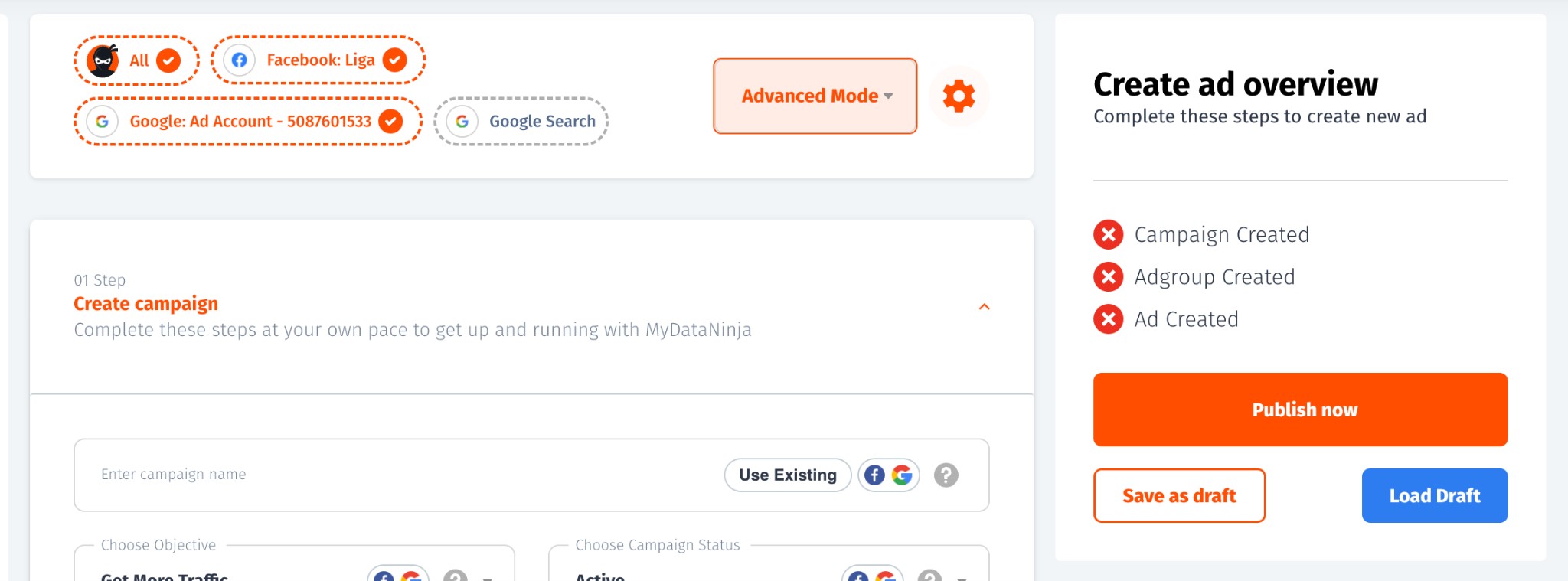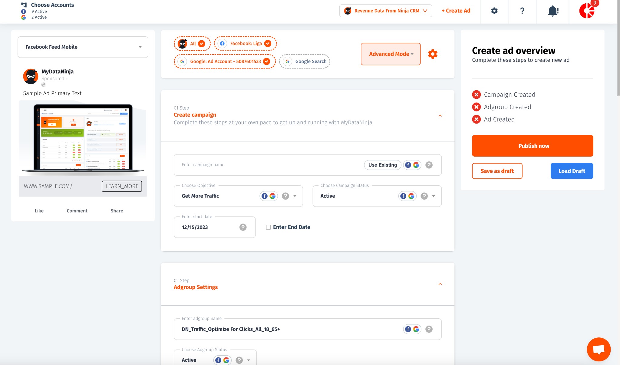 This is one of the coolest features we’ve developed. With the Ad Creation Module, you can effortlessly select accounts to create advertisements directly from MyDataNinja across multiple platforms. Currently, we support: