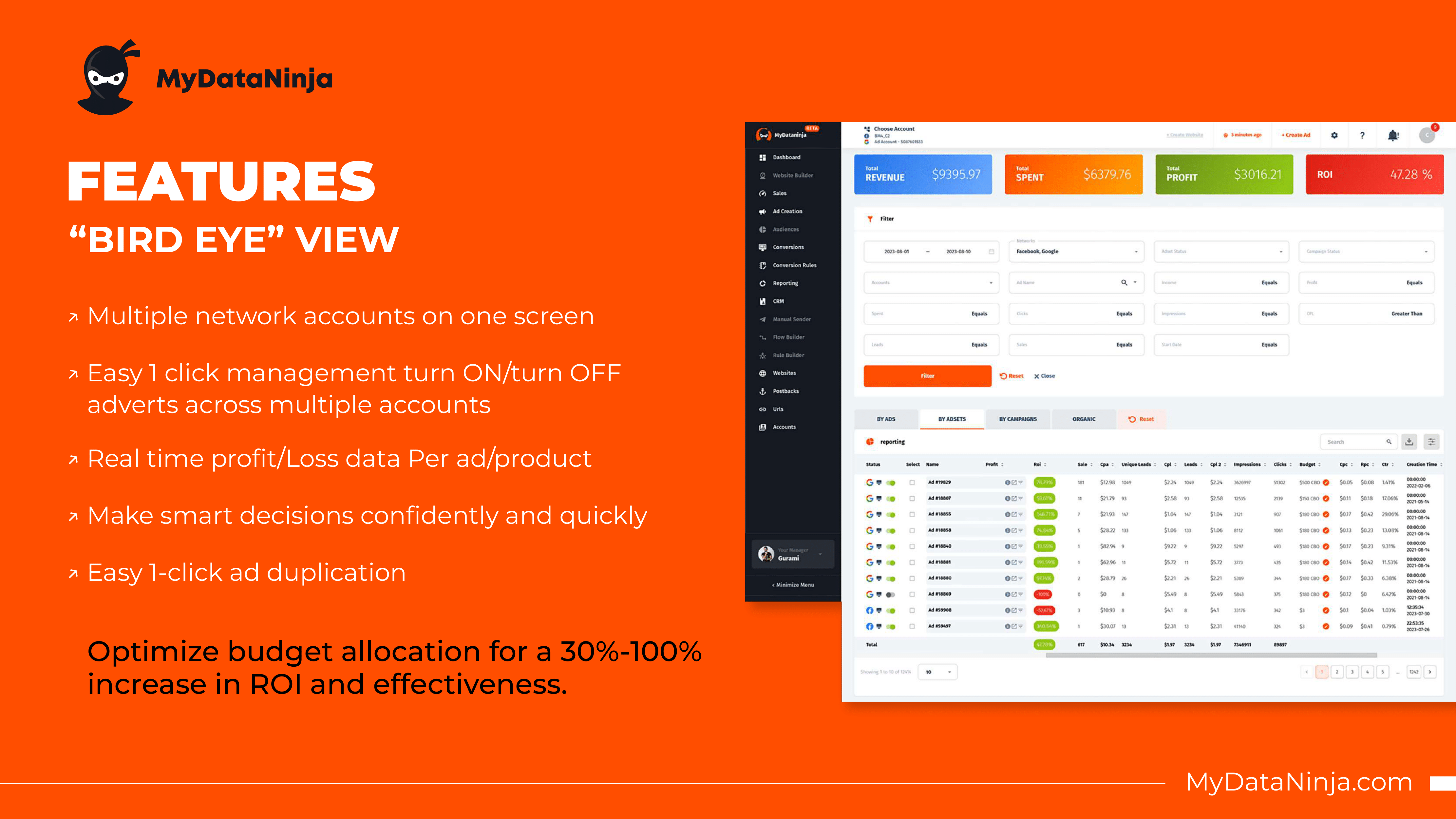 The significance of real-time data in advertising cannot be overstated. Many companies currently handle this task manually, typically on a weekly basis (in an optimal scenario), resulting in data inaccuracies, delayed information, and consequently, delayed decisions. MyDataNinja easily resolves these challenges. It provides instantaneous information on each advertisement’s profitability, precise ROI, and revenue, enabling swift identification and deactivation of underperforming ads. This not only optimizes budget spending but also has the potential to double or more the results by reallocating funds to high-performing advertisements.